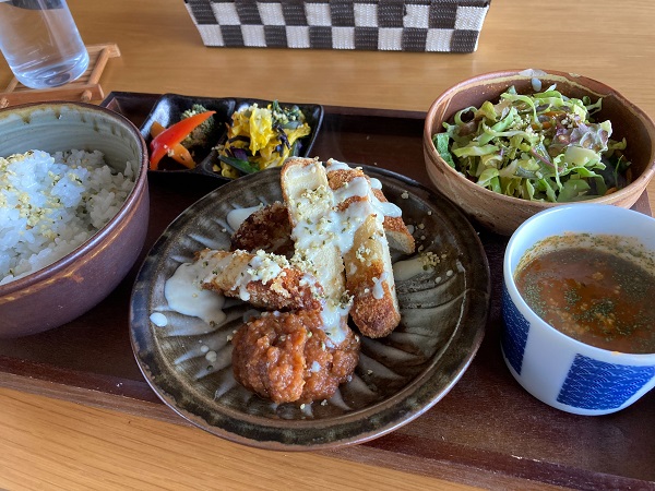 メインは、高野豆腐とテンペのカツ。上には、ソースと麻の実がもちろんトッピング。高野豆腐とテンペのカツはそれぞれ食感も違うため、飽きることなく食べることができたとともに、ボリュームもしっかりとあり、満足感が高かったです。
