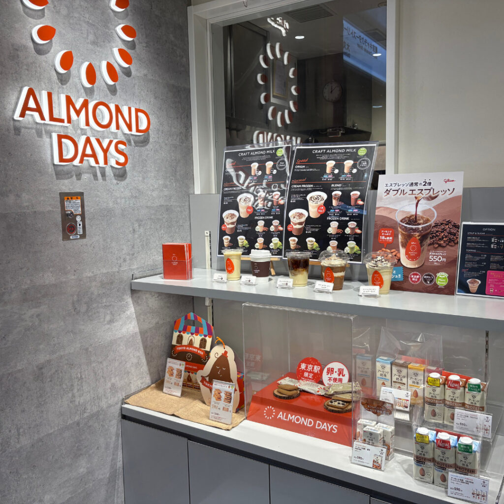 東京駅八重洲中央口改札の目の前、徒歩1分というアクセス抜群の場所にある「Glico ALMOND DAYS」は、その名の通りアーモンドの素材本来の力を活かした商品を提供するカフェです。江崎グリコが長年培ってきたアーモンドに関する知見をもとに、香ばしさや栄養価を余すことなく楽しめる空間をつくり上げています。店名の「DAYS」には「毎日」「生活」という意味が込められており、アーモンドを日々の暮らしに取り入れて、いつまでも健康で若々しく過ごしてほしいという想いが込められています。