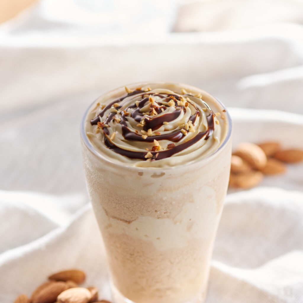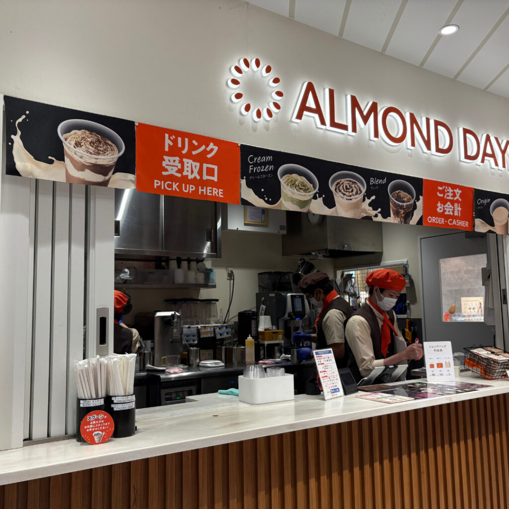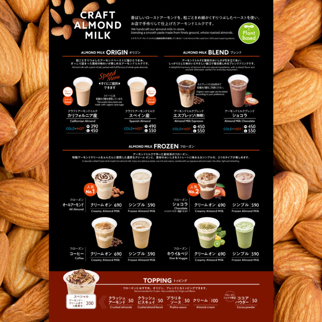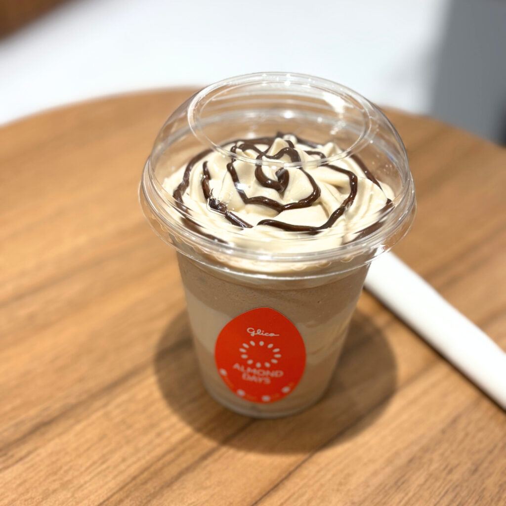 ドリンクは ORIGIN・BLEND・CREAM FROZEN と豊富なラインナップ。中でも人気の CREAM FROZEN オールアーモンド は、濃厚でありながら甘すぎず、すっきりとした後味が特徴。ホイップクリームもアーモンドミルククリーム、トッピングのプラリネソースもアーモンドという、まさに「オールアーモンド」な一杯です。